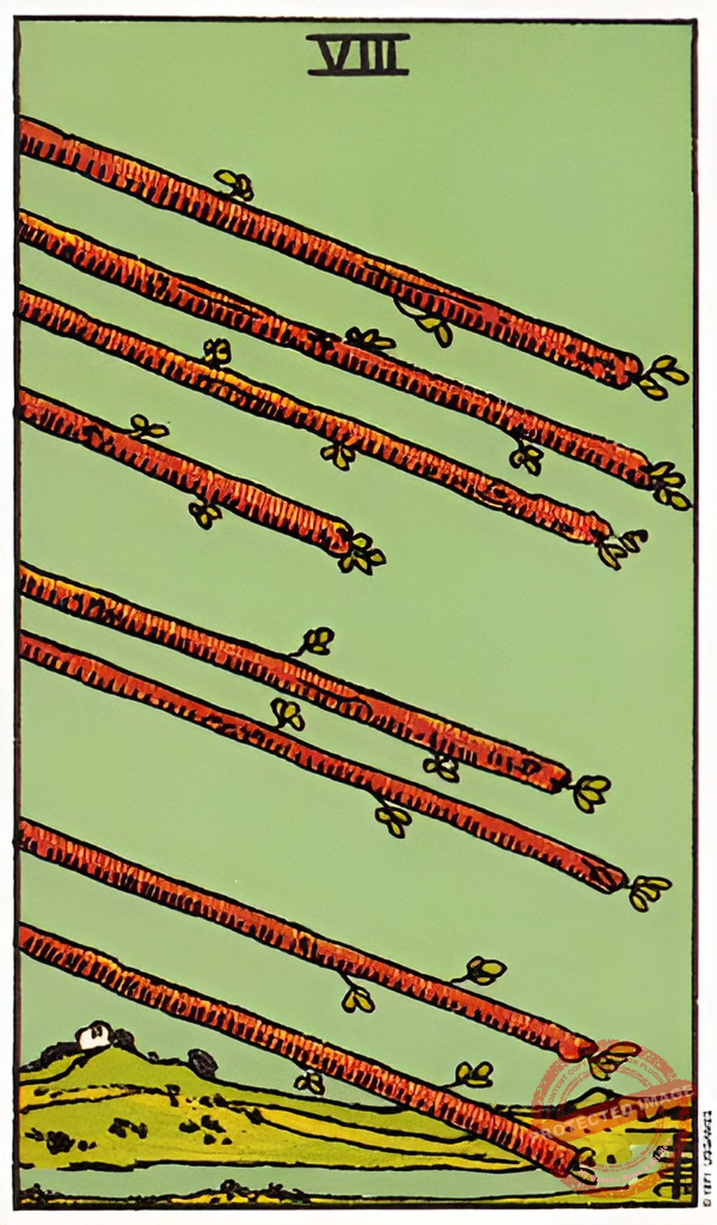 „Седмица Жезли“ е карта която говори за противопоставянето на предизвикателствата, които поставя животът. Този аркан подчертава способността да се справяме с трудности и да излизаме победители. Символиката на картата включва и териториален инстинкт. Настоятелност в защитата и готовност да запазим своето място, било то във връзката, кариерата или обществото.