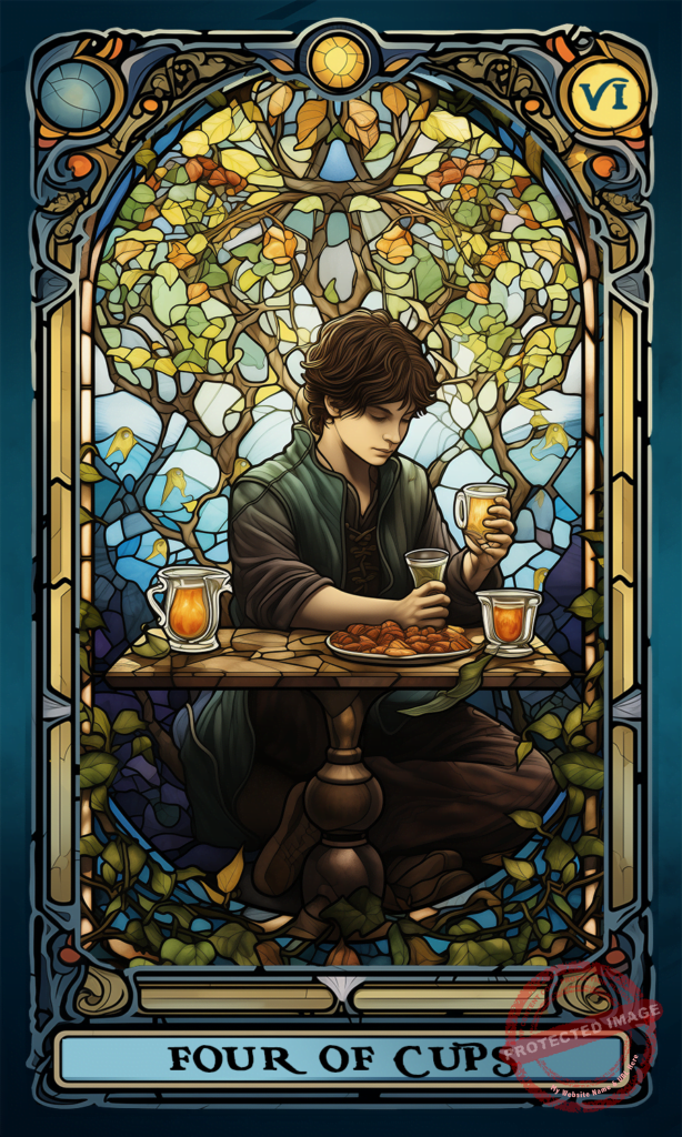 Четворка Чаши символизира момент на размишление, емоционално оттегляне и неудовлетвореност. Тази седмица може да се чувствате затворени в себе си или незадоволени от това, което се случва около вас. Възможно е да пропуснете важни възможности, защото сте твърде съсредоточени върху това, което ви липсва, вместо върху това, което ви се предлага. Четворка Чаши ви приканва да бъдете по-отворени към новите идеи и предложения, които идват в живота ви, дори ако в момента не изглеждат привлекателни. Тази карта напомня, че понякога решенията са по-близо, отколкото си мислите.